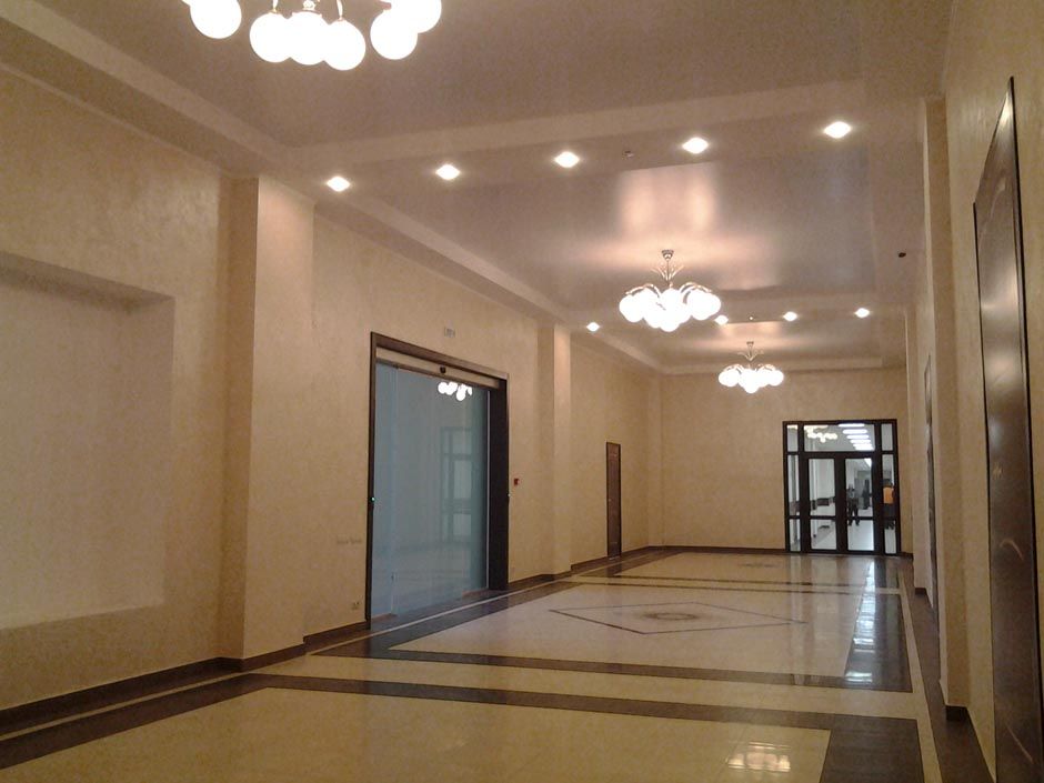 В интерьере данного помещения Вашему вниманию предстает обворожительная люстра SYBILA чешской фабрики ArtGlass. Ее оригинальный и утонченный дизайн придает холлу в офисном здании особое очарование. Использованы эти светильники в количестве трех штук, что позволило осветить помещение достаточно ярко. Решение дизайнеров проекта смелое и явно удовлетворило в должной мере требования заказчика.