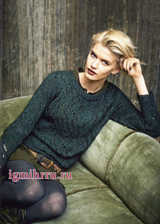 Зеленый ажурный пуловер из шелковой пряжи с добавлением мохера. Вязание спицами