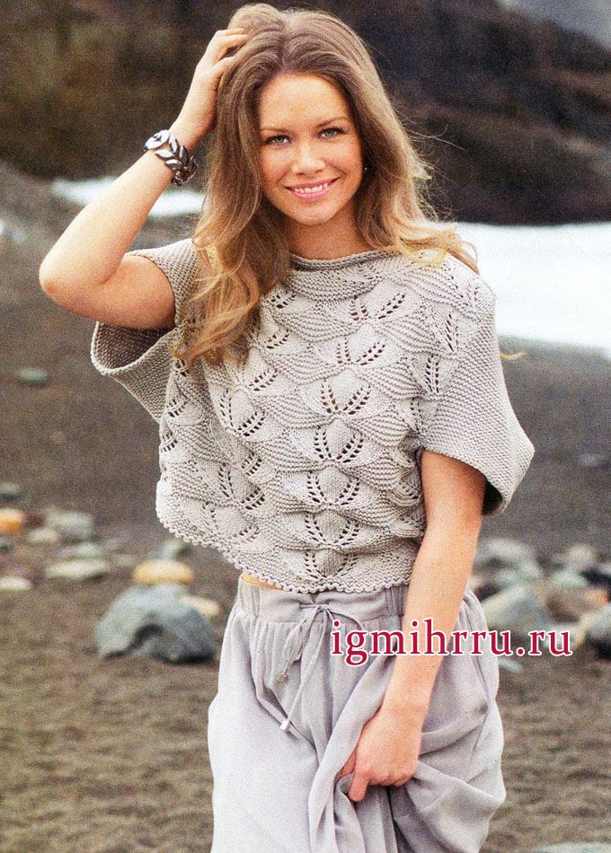 Серебристо-серый пуловер с ажурными узорами и цельновязаными рукавами. Вязание спицами
