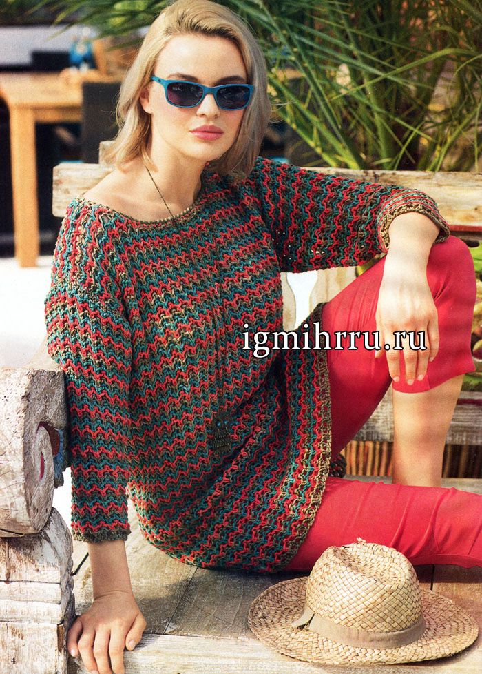 Удлиненный трехцветный пуловер с зубчатым орнаментом. Вязание спицами