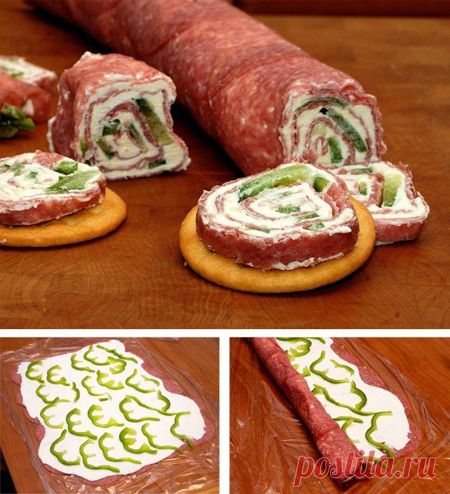 Muy Ingenioso Rollitos de queso y salami - Muy Ingenioso, салями, сливочный сыр, перец, крекеры