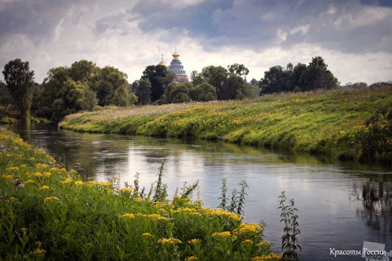 Цветущие берега реки Истры. Вдалеке возвышается ротонда Новоиерусалимского монастыря.
