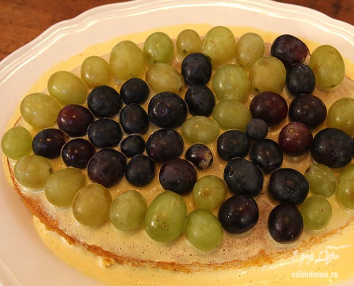 - На весь экран # шаг 8/9Остывший бисквит вынуть из формы, залить кремом забайоне, сверху выложить ягоды винограда.