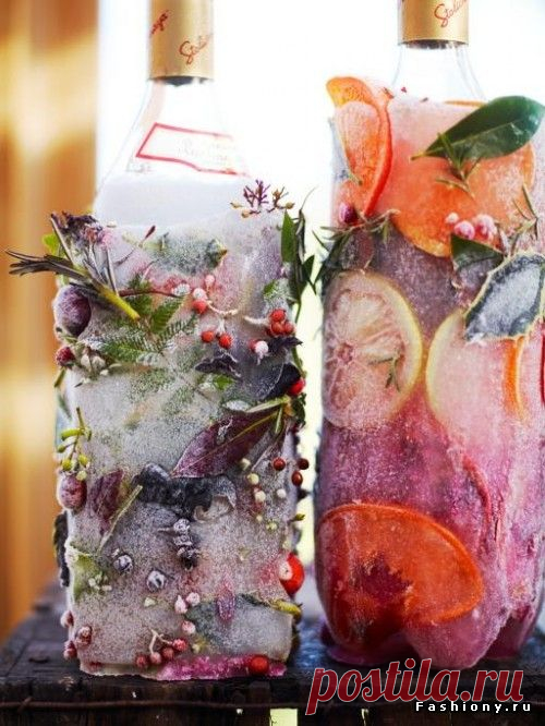 Долше сохранить напиток холодным (и, при этом, красиво оформить его) поможет пустая упаковка из-под сока: помесите в нее бутылку и залейте водой (для декора можно побросать цветы или кусочки фруктов), отправляйте в морозилку. Как только вода замерзнет, снимите упаковку и наслаждайтесь результатом!
