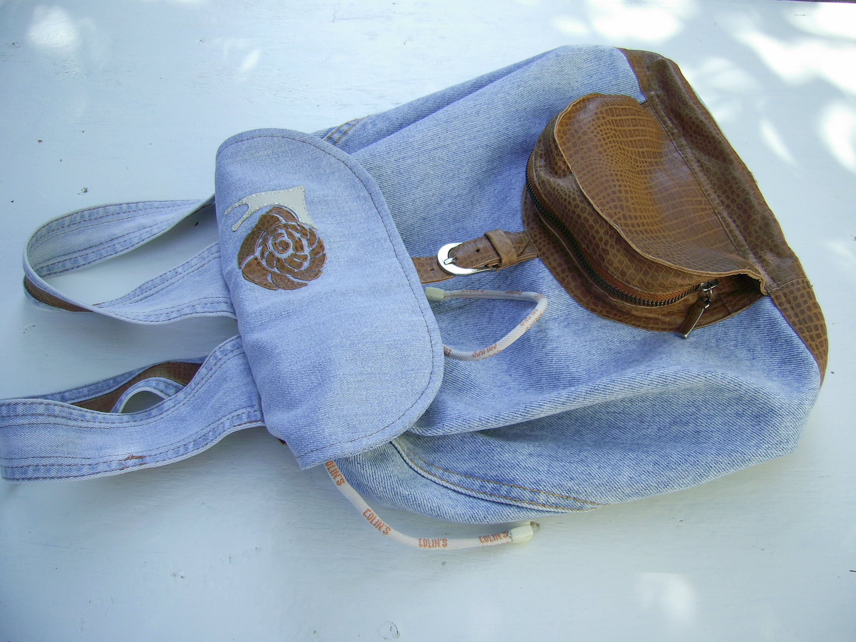 Рюкзак из джинсовой юбки и кусочков кожаной куртки / Прочие виды рукоделия / Шитье