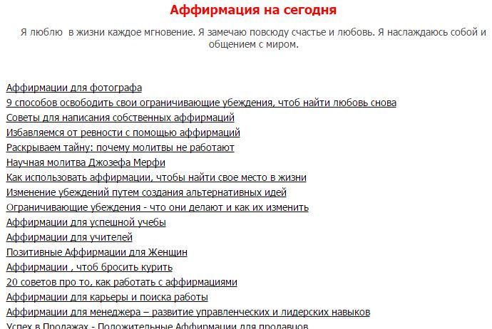 Позитивные аффирмации на каждый день: Аффирмации – это формулы самовнушения, которые помогают человеку настроить свое сознание на позитивную волну. С их помощью можно ускорить процесс исполнения желаний. Главное соблюдать определенные правила для составления и применения этих волшебных формул...