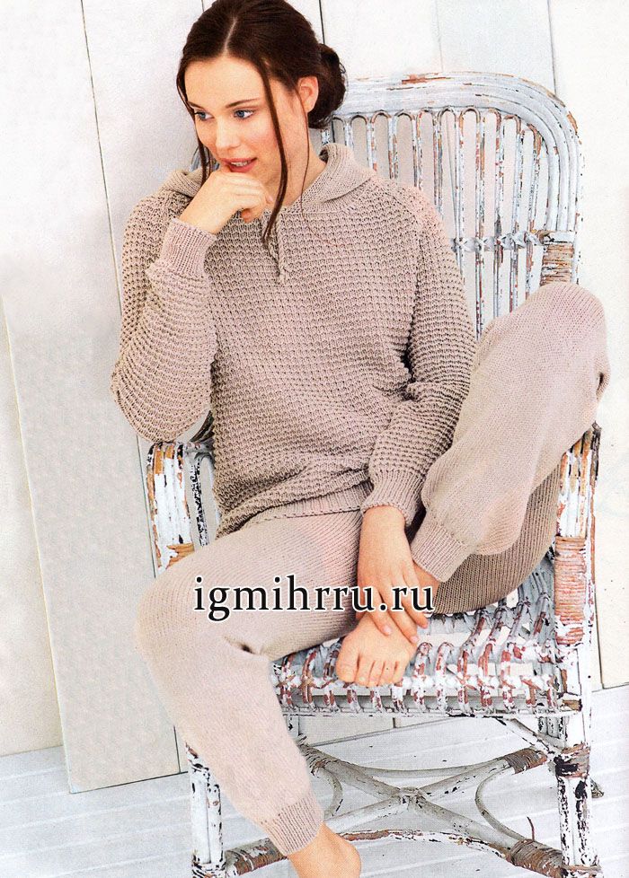 Удобная домашняя одежда. Мягкий костюм из брюк и толстовки с капюшоном. Вязание спицами