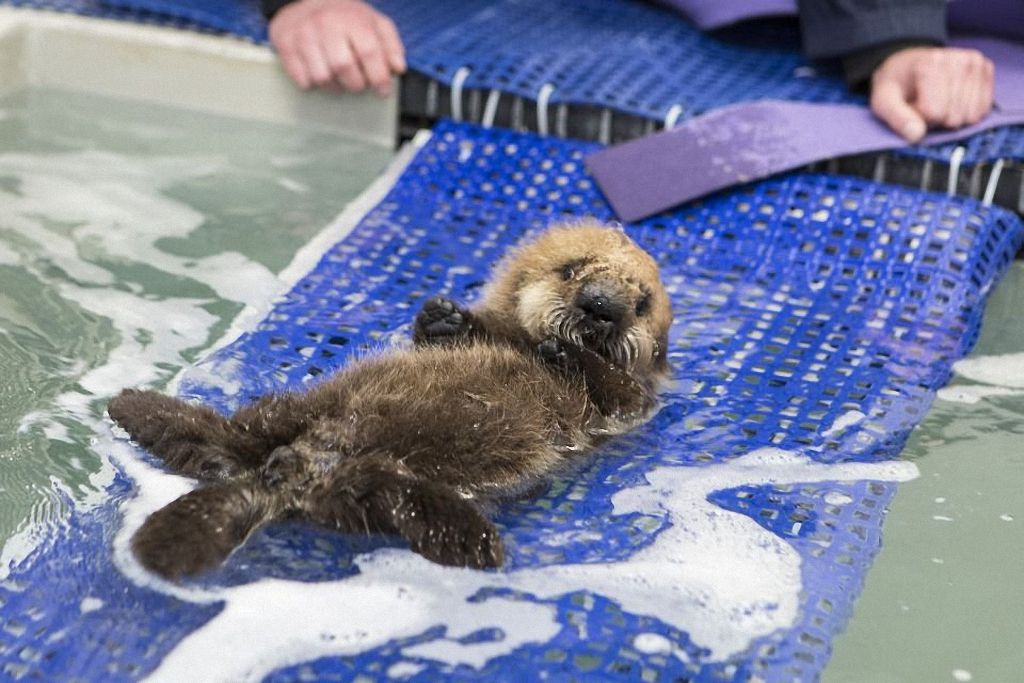 Спасенная маленькая морская выдра учится плавать