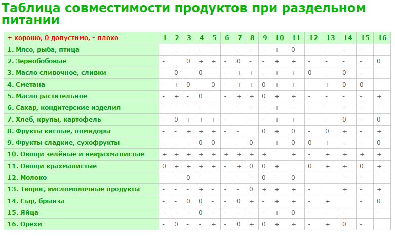 Таблица совместимости продуктов при раздельном питании - Системы питания - www.calorizator.ru
