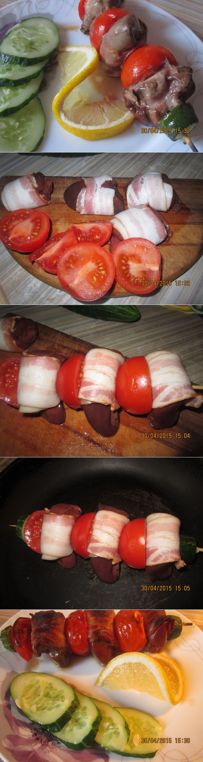 Шашлык из печени с помидорами на деревянных шпажках в духовке