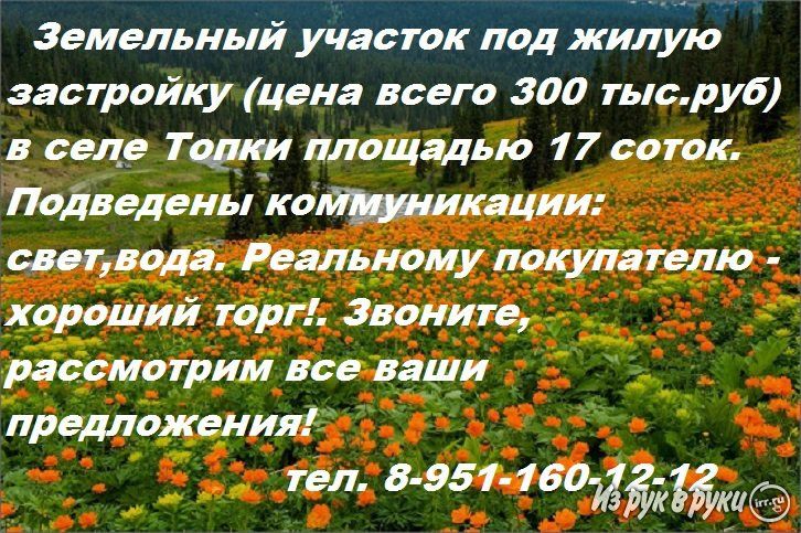 Участок 17 соток, Топкинский р-н, Топки с, собственность, земли населенных пунктов, Кемеровская обл, Топкинский р-н, Топки с. Цена 300000 руб. - ИЗ РУК В РУКИ
