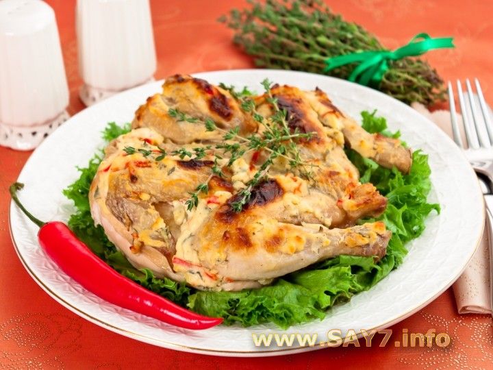 Цыпленок, запеченный под кремом из Филадельфии, чеснока, перца и тимьяна