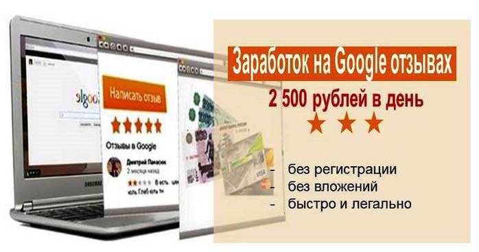 2500 рублей в день на Google отзывах. Метод заработка для тех, кому срочно нужны деньги, но нет времени на длительное обучение. Этот способ заработка отличается своей невероятной простотой. Эта простота позволит Вам получать большие хорошие деньги на свой счет, абсолютно легально и без вложений. Если Вам срочно нужны дополнительные средства, то этот метод заработка как раз то, что нужно.
