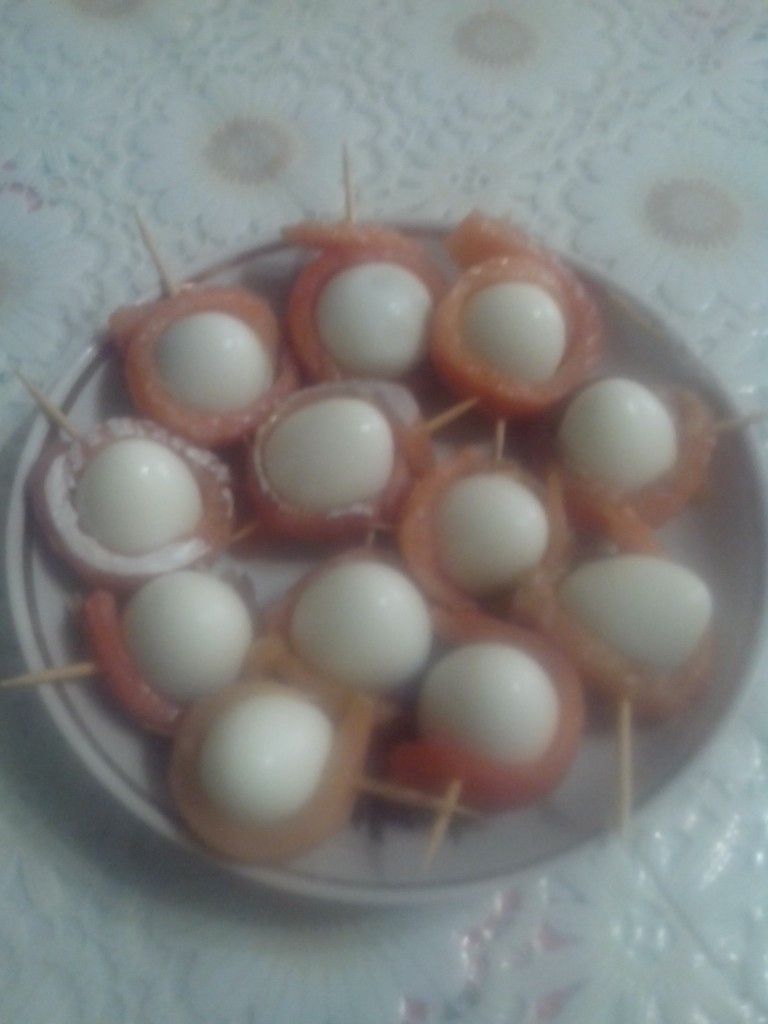 ЯЙЦА ПЕРЕПЕЛИНЫЕ !!! **Удобная закуска! *Яйца, обернутые солёной рыбкой -горбуша. Рыбные полоски закрепи зубочисткой. Вот, и всё!