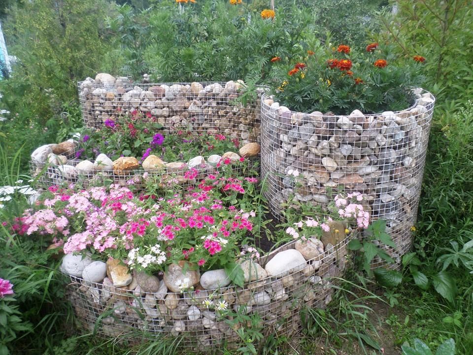 Использование габионов для создания круглых и полукруглых клумб в саду. В самом просто варианте нам понадобятся сетка с квадратной ячейкой (лучше оцинкованная) камни более или менее одинакового среднего размера, геотекстиль для прокладки и плодородный грунт.