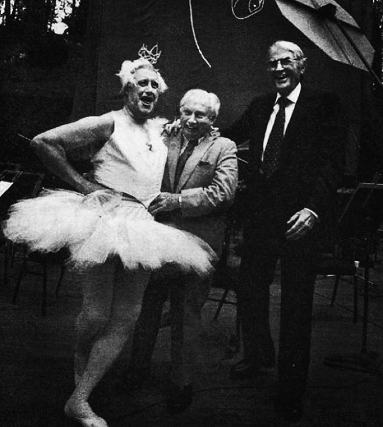 Исаак Штерн отмечает 70-летний юбилей вместе с Мстиславом Ростроповичем (в пачке) и Грегори Пеком. #art #music #celebs