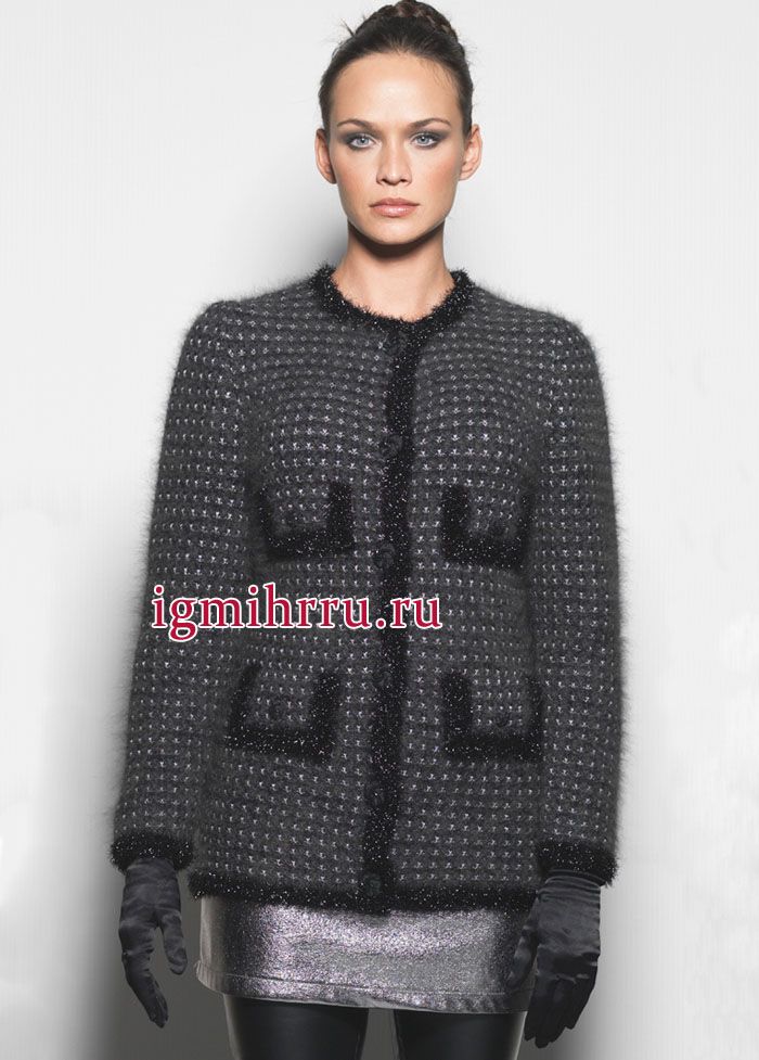 Элегантный серо-черный жакет в стиле Шанель, с клетчатой вязкой «под домино». Вязание спицами
