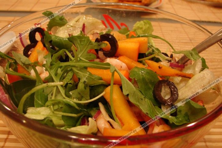 Салат из хурмы, креветок и маслин пошаговый рецепт с фото