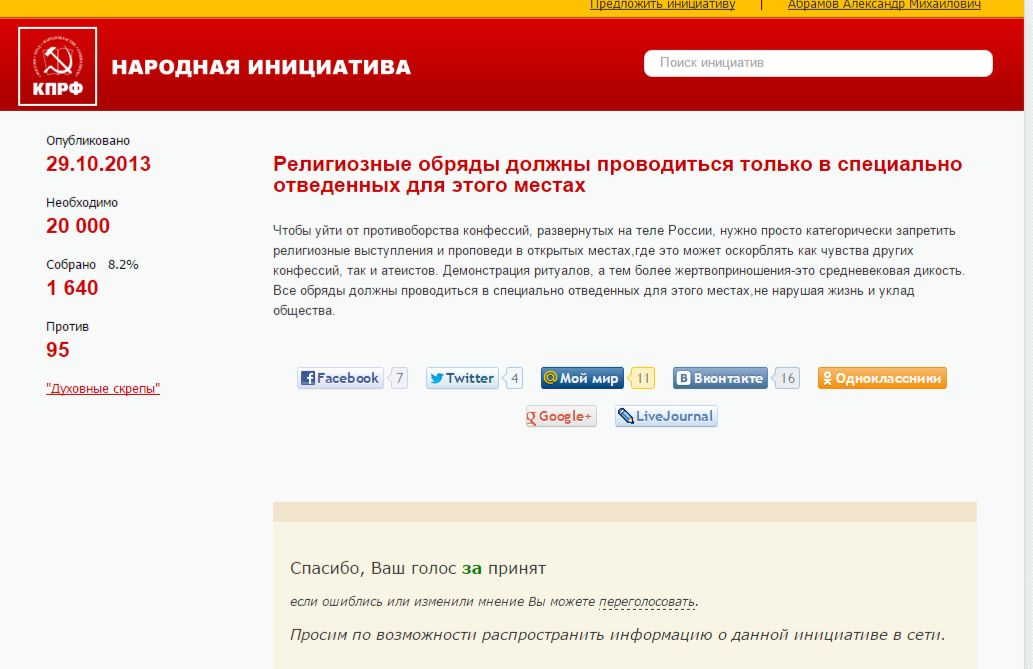 Поддржите народную инициативу! #РПЦ к ответу за преступления! Чтобы уйти от противоборства конфессий, развернутых на теле России, нужно просто категорически запретить религиозные выступления и проповеди в открытых местах,где это может оскорблять как чувства других конфессий, так и атеистов. Демонстрация ритуалов, а тем более жертвоприношения-это средневековая дикость. Все обряды должны проводиться в специально отведенных для этого местах,не нарушая жизнь и уклад общества