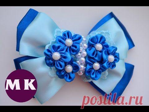 Мастер-класс Канзаши.Цветы из лент.Бант Канзаши.Незабудки Канзаши/Bow with Forget-me-nots Kanzashi