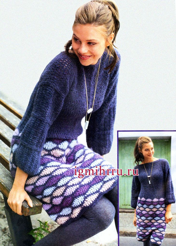 Теплое синее платье с юбкой из разноцветного волнистого узора. Вязание крючком
