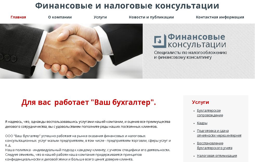 Финансовые и налоговые консультации. ООО "Ваш бухгалтер" успешно работает на рынке оказания финансовых и налоговых консультационных услуг малым предприятиям, в том числе - предприятиям торговли, сферы услуг и т. д. Среди наших услуг: — ведение учёта для УСН и ИП — сдача отчётности через интернет в налоговую, ПФР, ФСС — расчет и снижение налогов — решение проблем с налоговыми органами — консультирование по любым бухгалтерским вопросам — восстановление бухгалтерского учета