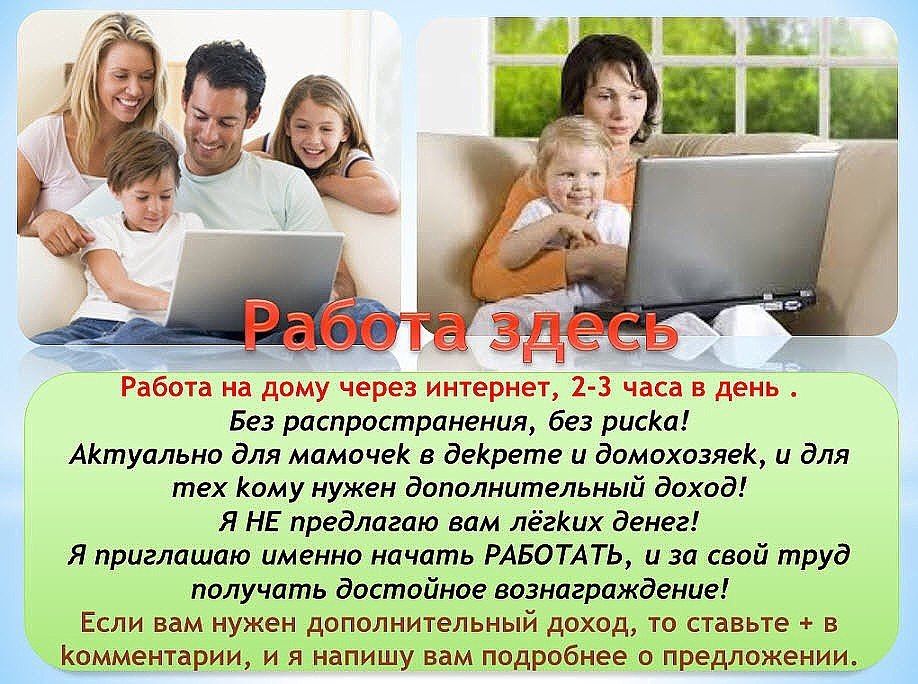 СТРОЙТЕ КАРЬЕРУ В ИНТЕРНЕТЕ! Без отрыва от дома и семьи; Без финансовых рисков и распространения продукции, зарплата без задержек и стабильна! Эффективный интернет-проект, в котором может работать любой человек. Не важно, какое у вас образование-ГЛАВНОЕ ЖЕЛАНИЕ РАБОТАТЬ! Торопитесь, не ждите! Вышлю подробную информацию в ЛС .