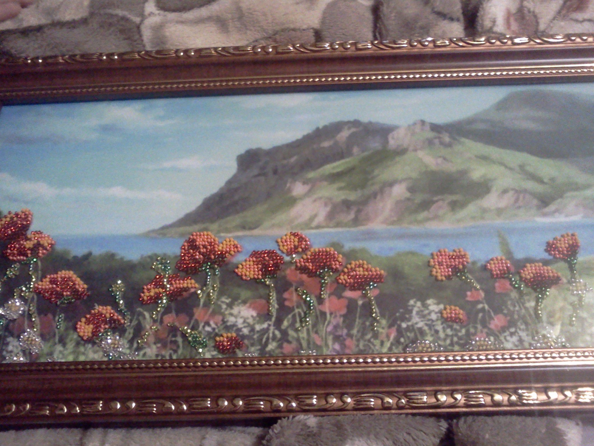Картина с багетом+стекло-вышитая чешским бисером-шелкография-горный пейзаж.