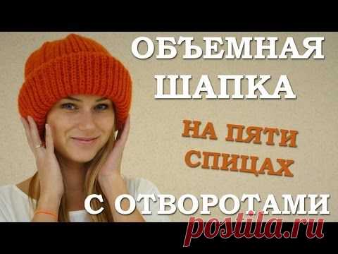 Объемная шапка с отворотами. Вязаная шапка спицами