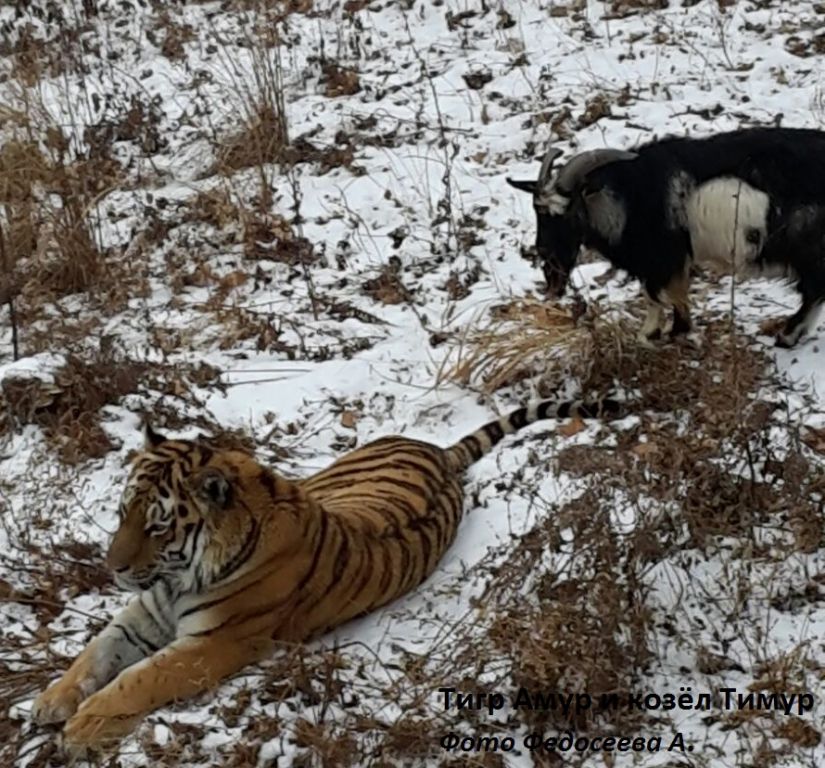 Амурский тигр подружился с отданным ему на съедение козлом Тимуром.