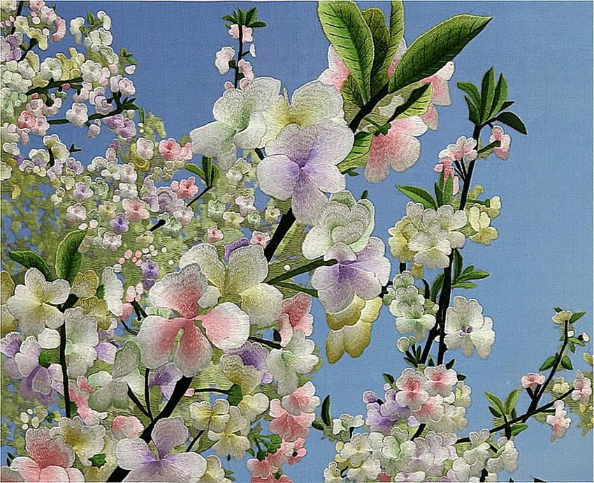 Цветущая вишня. Вышивка шёлком по шёлку.