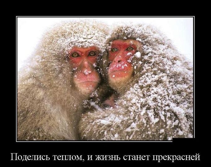 Фото Две обезьянки тесно прижались друг к другу, чтобы не замерзнуть под снегом (Поделись теплом, и станет жизнь прекрасней)