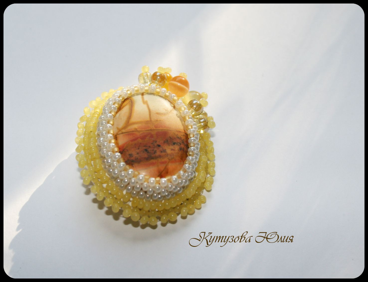 "Солнечная" брошьМатериаллы: яшма,чешский и японский бисер,Чешские бусины.Натуральная кожа с обратной стороны.