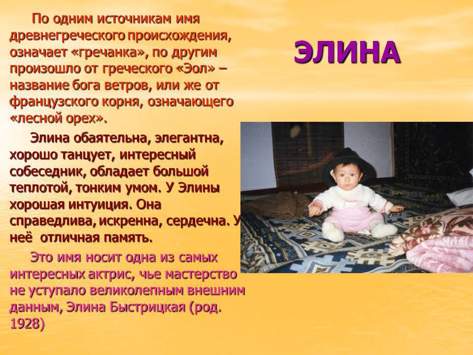 Элина. По одним источникам имя древнегреческого происхождения, означает «гречанка», по другим произошло от греческого «Эол» – название бога ветров, или же от французского корня, означающего «лесной орех». Элина обаятельна, элегантна, хорошо танцует, интересный собеседник, обладает большой теплотой, тонким умом. У Элины хорошая интуиция. Она справедлива, искренна, сердечна. У неё отличная память. Эо имя носит одна из самых интересных актрис, чье мастерство не уступало великолепным внешним данным