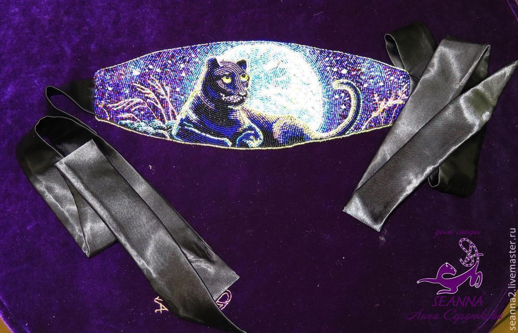 Купить Пояс-кушак-оби, вышитый бисером, безразмерный "Пантера и Луна" - тёмно-фиолетовый