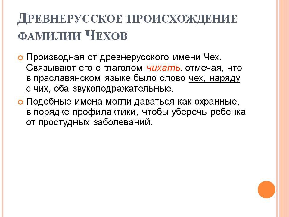 Древнерусское происхождение фамилии Чехов. Производная от древнерусского имени Чех. Связывают его с глаголом чихать, отмечая, что в праславянском языке было слово чех, наряду с чих, оба звукоподражательные. Подобные имена могли даваться как охранные, в порядке профилактики, чтобы уберечь ребенка от простудных заболеваний. - Слайд 17 - Происхождение фамилии - Имя - Презентации по психологии