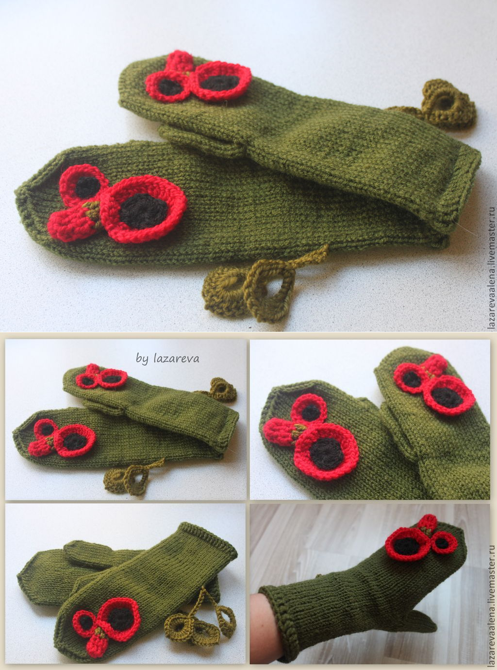 Купить СЕРИЯ, ВАРЕЖКИ " МАКИ" - варежки, маки, зеленые, варежки с цветами, дизайнерские варежки