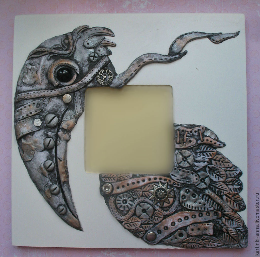 Панно зеркало Мудрая Птица (стимпанк, ворон) - серебряный, биомеханика, птица, панно на стену