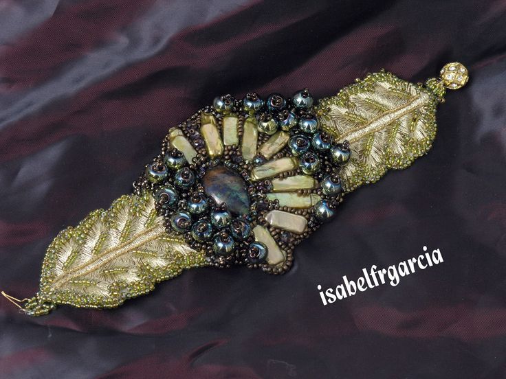 (537) ISABEL FR GARCÍA: cabouchon azurite embroidery, hojas bordads hilo oro y canutillo, perlas barrocas | Bead Embroidered Bracelet