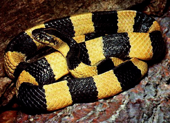 Ленточный крайт относится к семейству аспидовых. Проживает в тропиках Индии и на юге Китая. Эти змеи ведут ночной образ жизни и проживают в воде. Их называют еще застенчивыми змеями, потому что они любят скромно прятать голову за хвостиком.