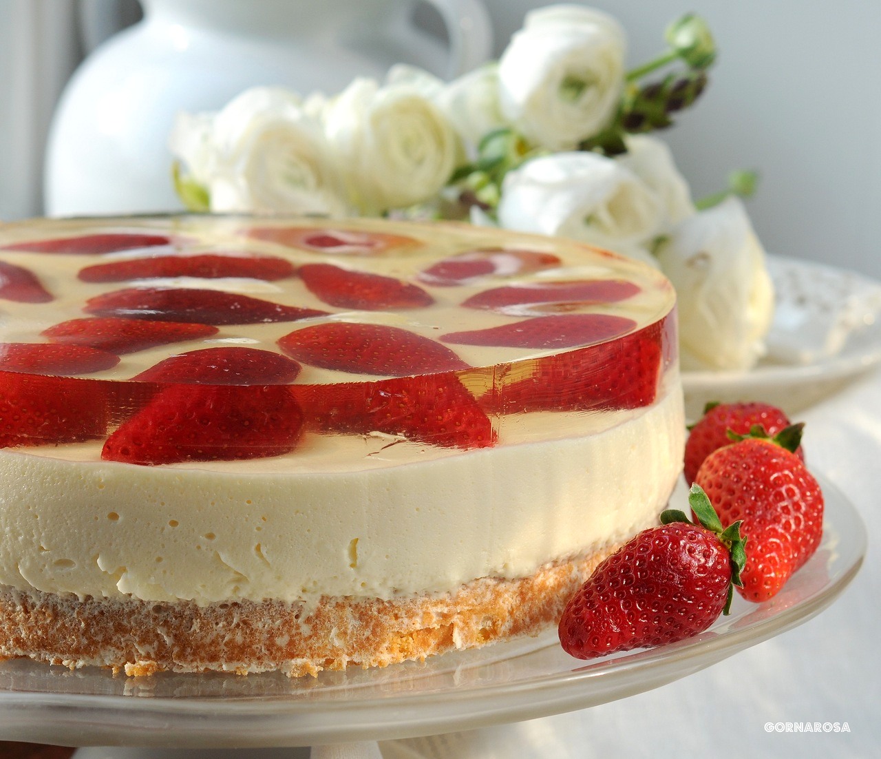 Миндально-масляный бисквит, сливочный мусс с шампанским и клубника в желе из шампанского.