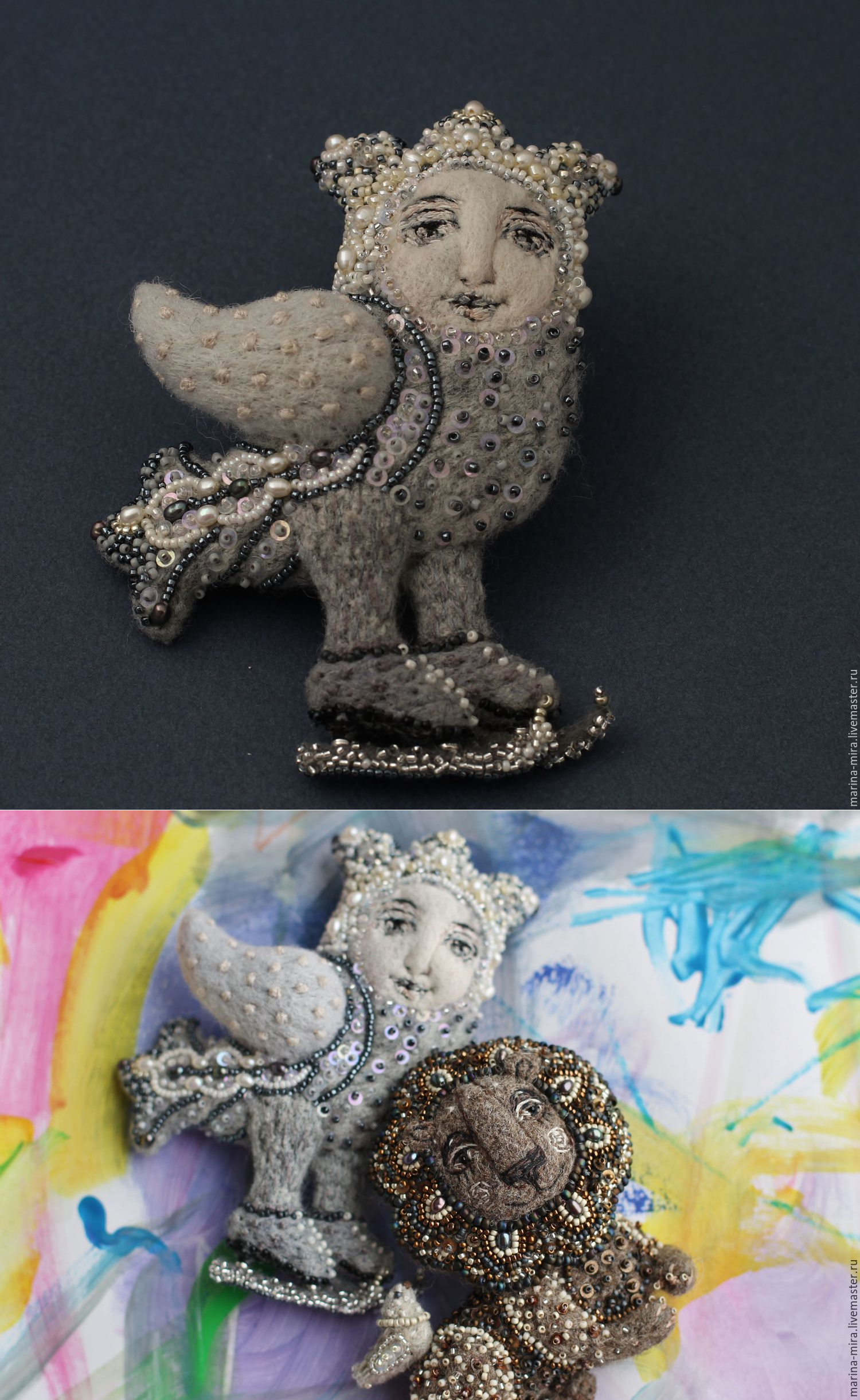 Купить птичка брошь войлочная брошь Птица Сирин, серия Сказочный лес. - коричневый