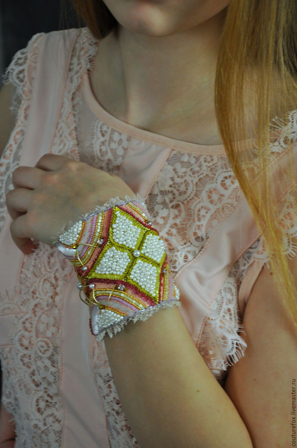 Купить Res. Браслет "Восточная сказка" - розовый, персиково-розовый, жемчужный, золотой, широкий браслет