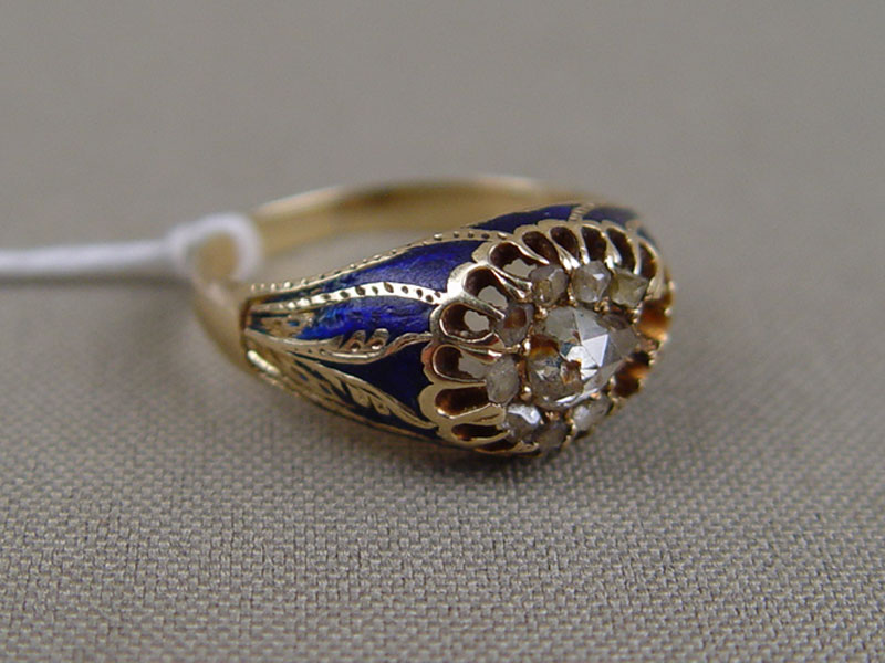 Лот 21354. Кольцо, золото по реактиву 583 пробы, общий вес — 5,5 г. Вставки: бриллианты (1 бриллиант «роза» — 0,42ct; 8 алмазов), эмаль (утраты)