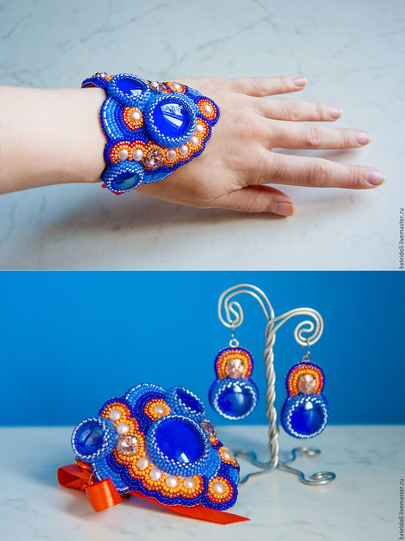 Купить Браслет и серьги "Закат на Сапфировом острове" - синий, тарт, сапфировый, оранжевый, закат