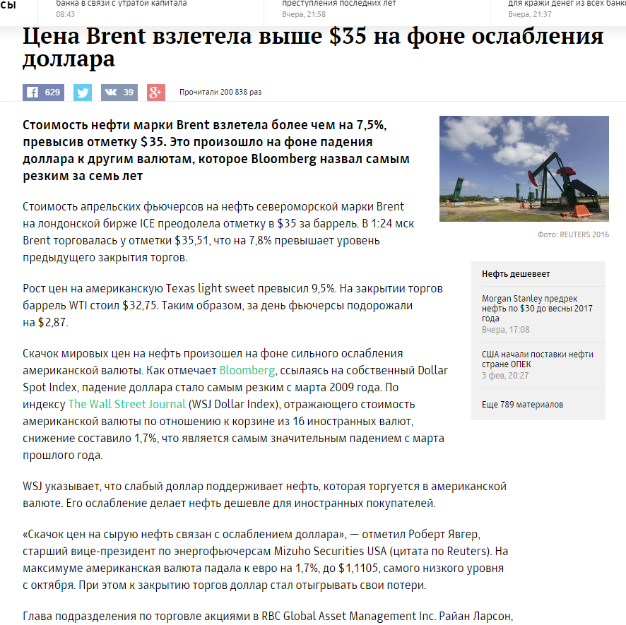 Цена Brent взлетела выше $35 на фоне ослабления доллара :: Финансы :: РБК