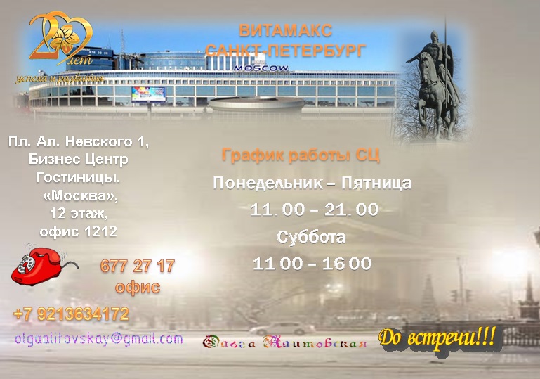 С 1 февраля 2016 года наш СЦ ВИТАМАКС СПб работает по новому адресу: Пл. Ал. Невского 1, Бизнес Центр Гостиницы «Москва», 12 этаж, офис 1212 телефон: 677 27 17 +79213634172 График работы СЦ Понедельник – Пятница 11. 00 – 21. 00 Суббота 11 00 – 16 00