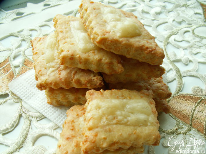 - На весь экран # шаг 5/6 Тесто достаем из холодильника и даем ему согреться.Духовку разогреваем на 170-180С. Раскатываем пласт толщиной около 1 см. Нарезаем печенье произвольной формы, выкладываем его на противень, застеленный пекарской бумагой. На каждый кусочек кладем сырную стружку. Выпекаем печенье 12-15 минут до золотистого цвета.