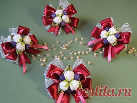 Бутоньерка - брошь или заколка в стиле канзаши. Ленты, кружево и цветы из фоамирана.