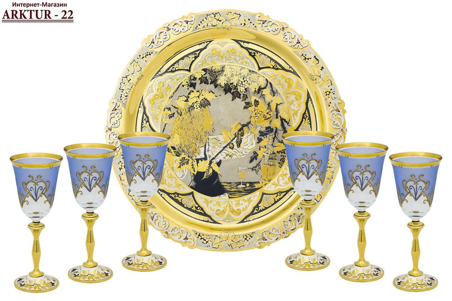 Набор состоит из блюда мельхиорового инкрустированного камнями, шести фужеров объемом 220 мл. из богемского стекла.